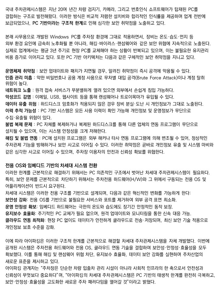 “노후화·보안위기 겪는 주차관제...차세대 클라우드 시스템이 해법” 목록 PREV 업계최초 24시간이내 해결, 주차업계 A/S처리속도 1위 NEXT [비즈투데이] 아이파킹, '365클라우드2.0' 출시