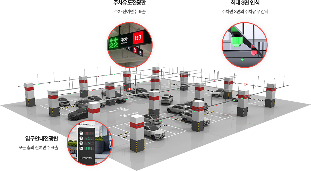 3면 초음파유도 시스템은 기존 주차 감지 방식의 복잡한 구조와 높은 운영 비용 문제를 개선한 통합형 차세대 주차 유도 솔루션입니다.